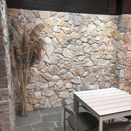 Vari Stone is a premium large-format random stone wall cladding designed to create bold, organic feature walls with strong architectural presence. Characterised by its freeform shapes and varied stone sizing, Vari Stone delivers a natural, hand-laid appearance that cannot be replicated with uniform stone systems.
